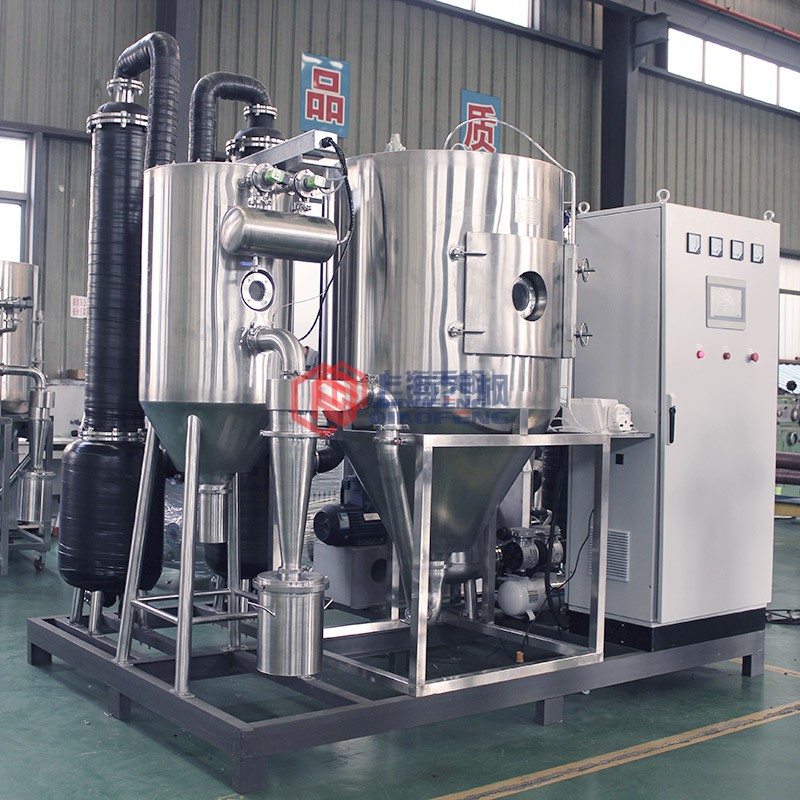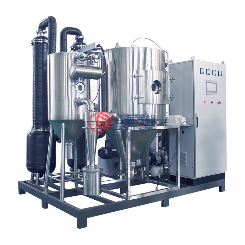 設(shè)備主要由:送料系統(tǒng)、加熱系統(tǒng)、霧化系統(tǒng)、噴霧干燥系統(tǒng)、惰性氣體循環(huán)系統(tǒng)、產(chǎn)品回收系統(tǒng)、冷凝系統(tǒng)組成。