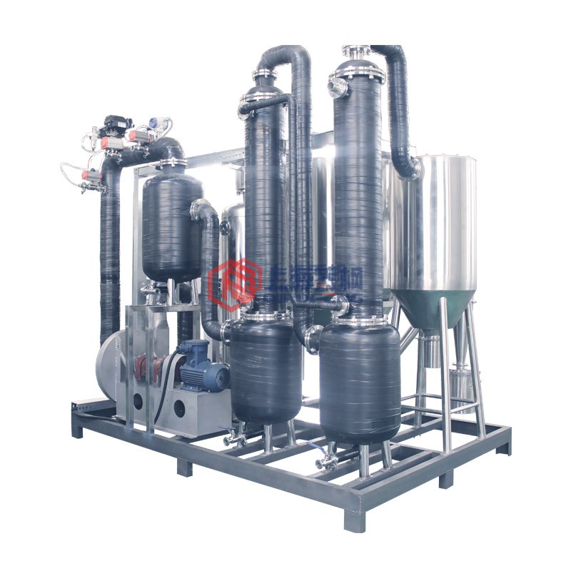從干燥塔底部排出的氣體中含有粉料和有機(jī)溶劑蒸汽,采用過(guò)濾裝置進(jìn)行回收,將粉料和有機(jī)溶劑氣體進(jìn)行分離,粉料回收,有機(jī)氣體進(jìn)入冷凝器進(jìn)行回收并重復(fù)利用。