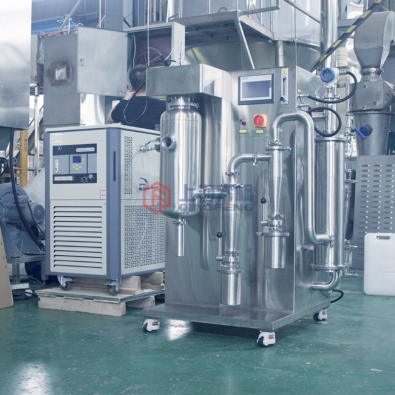 設(shè)備主要由:送料系統(tǒng)、加熱系統(tǒng)、霧化系統(tǒng)、噴霧干燥系統(tǒng)、惰性氣體循環(huán)系統(tǒng)、產(chǎn)品回收系統(tǒng)、冷凝系統(tǒng)組成。